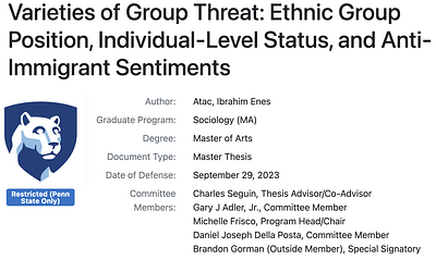 I received the 2024 Huber-Form Sociology Master Thesis Award for my thesis, “Varieties of Group Threat: Ethnic Group Position, Individual-Level Status, and Anti-Immigrant Sentiments.”